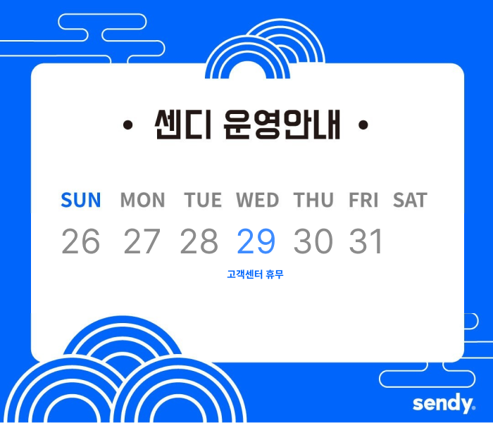 1/29(설 당일)에는 센디 고객센터가 운영되지 않으며, 운송 서비스 제공이 어려우니 이 점 유의해 주세요.