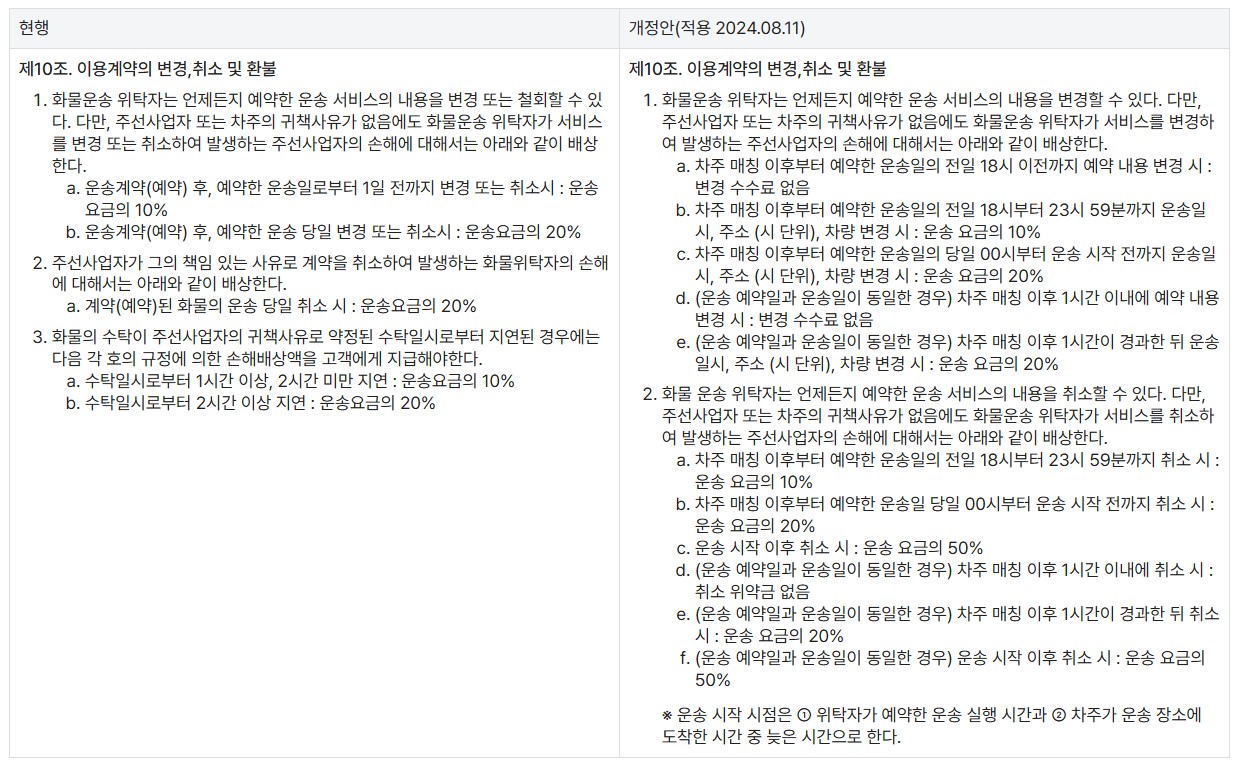 2024년 07월 11일 변경된 주식회사 센디의 ‘화물자동차 운송주선약관’의 일부 내용을 공유드립니다.적용 일자 : 2024년 8월 11일개정 사유 : 변경 수수료 및 취소 위약금 약관 내용 변경변경 내용을 확인하시어 서비스 이용에 불편함이 없으시길 바랍니다.