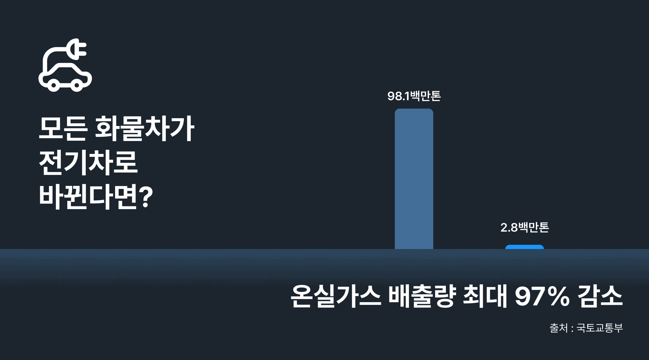 그런데 만약, 대한민국의 모든 내연기관 화물차가 전기 화물차 전환만 해도 탄소 배출을 최대 97%까지 감축할 수 있다고 해요.